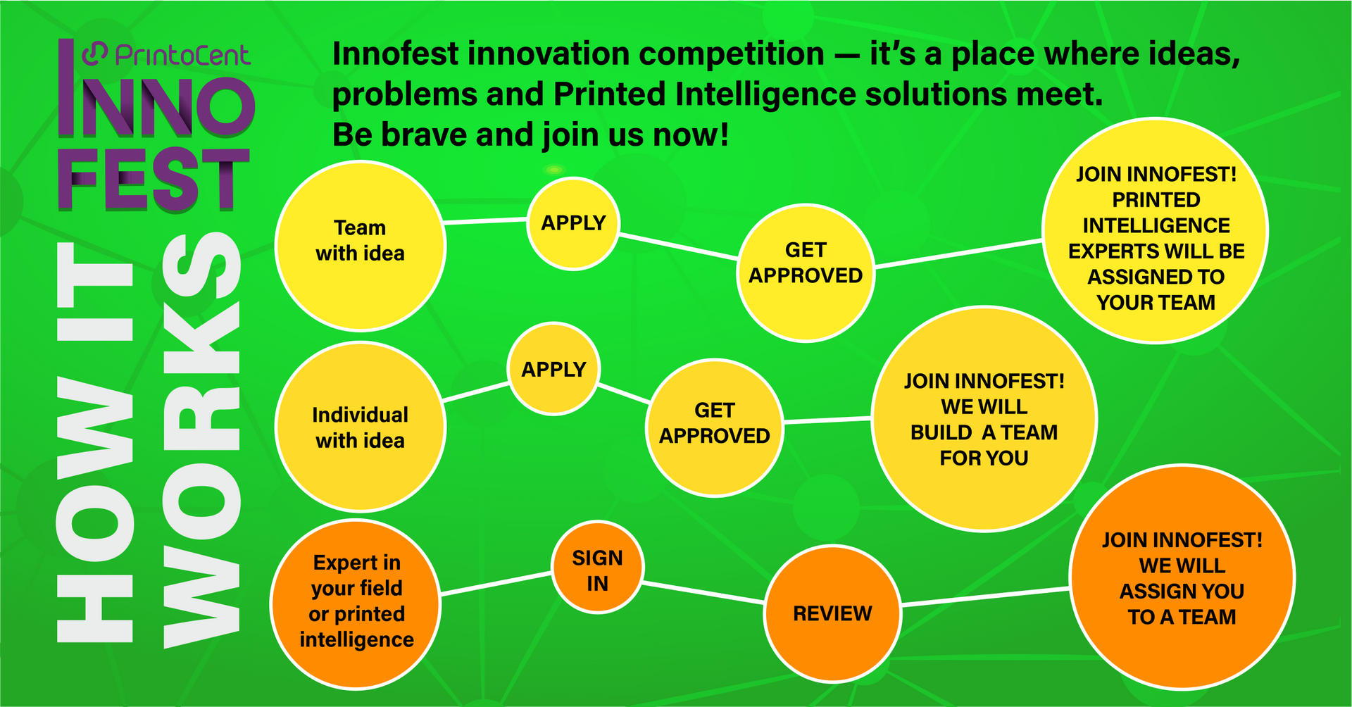 PrintoCent InnoFest is an innovation competition — it’s a place where ideas, problems and Printed Intelligence solutions meet. PrintoCent has hosted PrintoCent InnoFest events in Oulu, Finland, annually since 2014, so we are gathering for the 12th time this year! This open innovation event has been the launching arena for several innovations and start-ups, new products and business opportunities in existing companies.